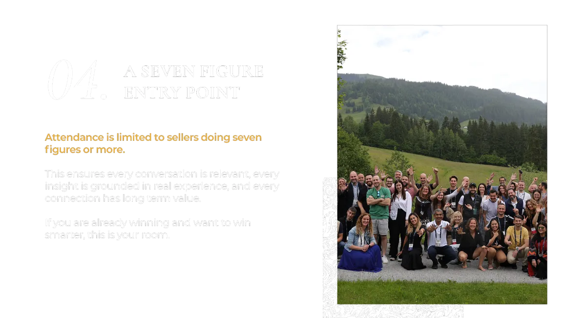 This event is exclusively for sellers generating at least $1M in annual revenue, with many participants being 8-figure sellers.