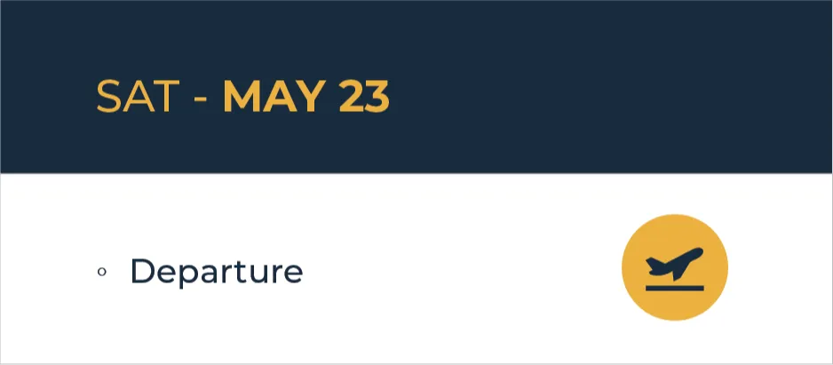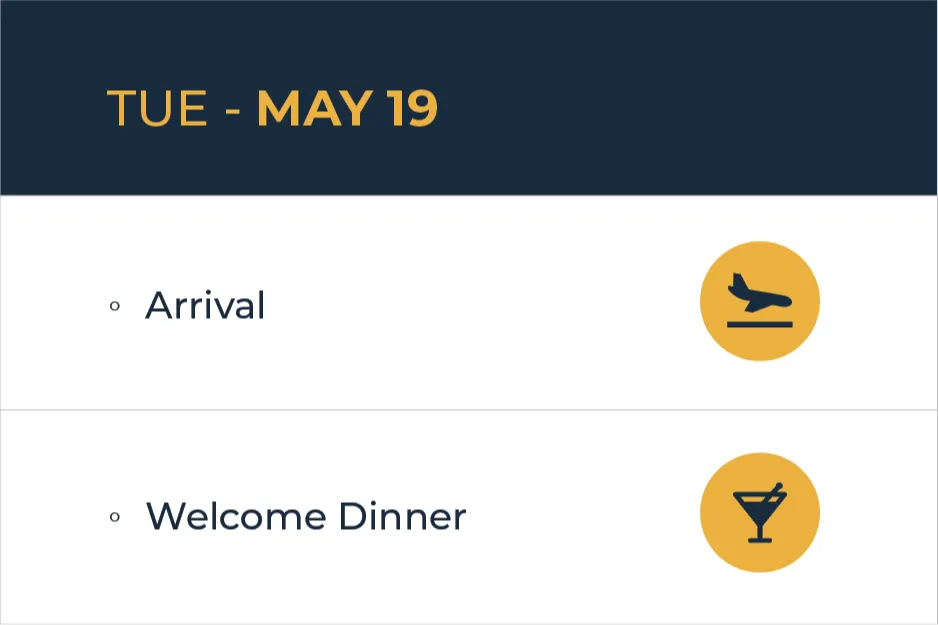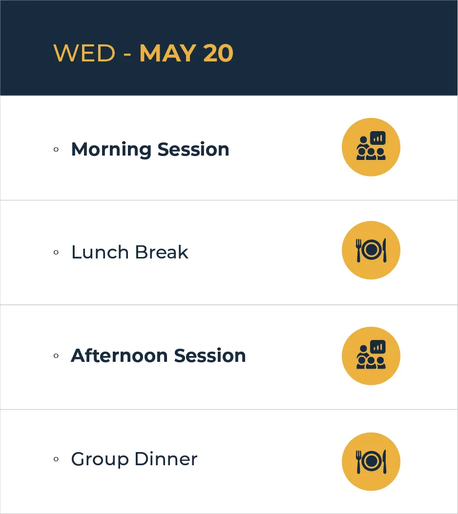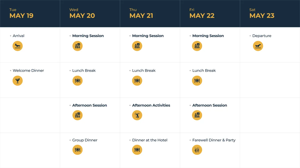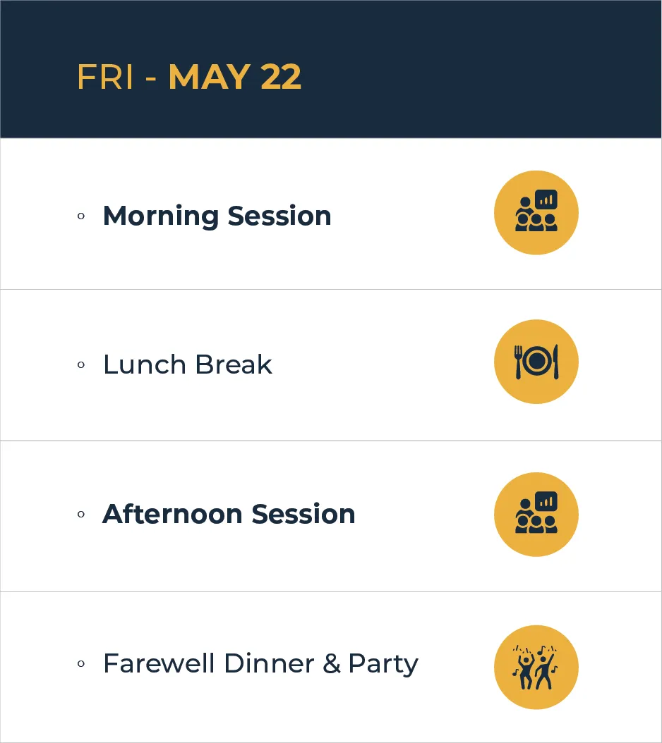 Check-in on May 19, with the event running May 20-22. The farewell dinner concludes the event on May 22, with departure options that evening or the morning of May 23.