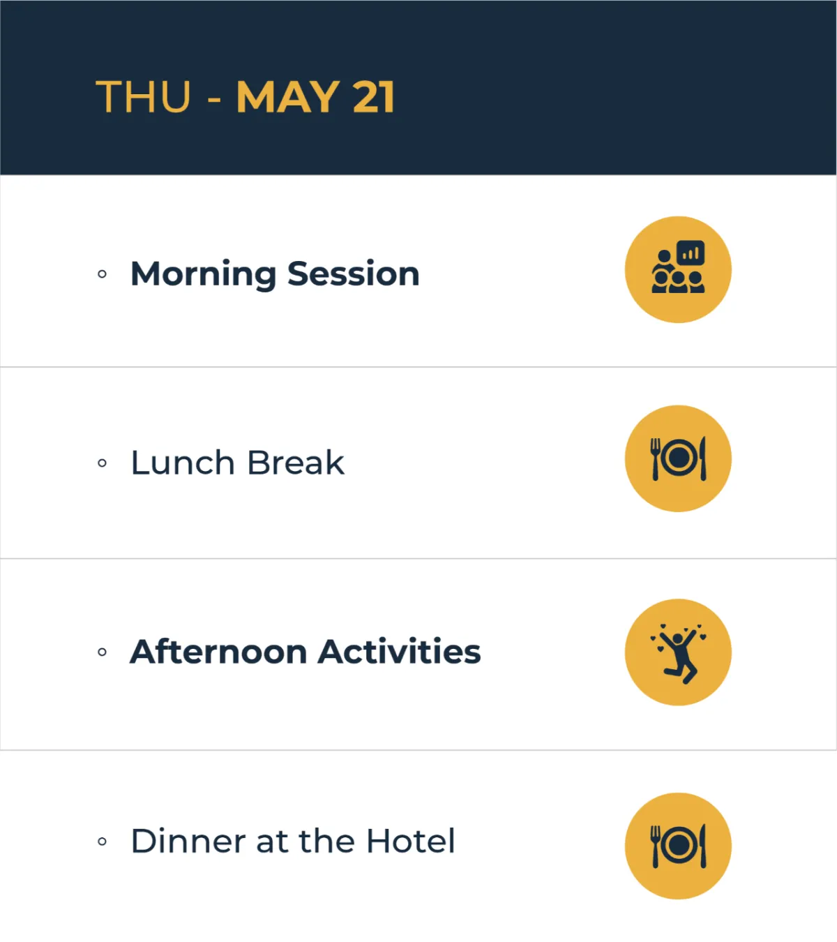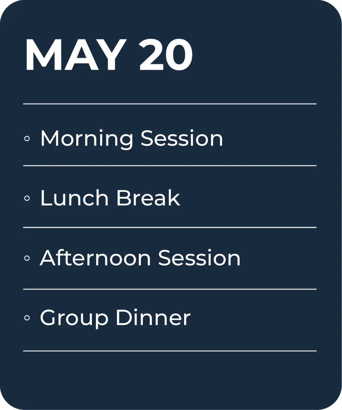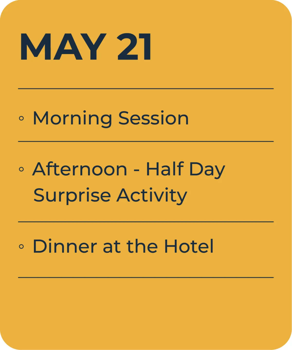 Check-in on May 19, with the event running May 20-22. The farewell dinner concludes the event on May 22, with departure options that evening or the morning of May 23.