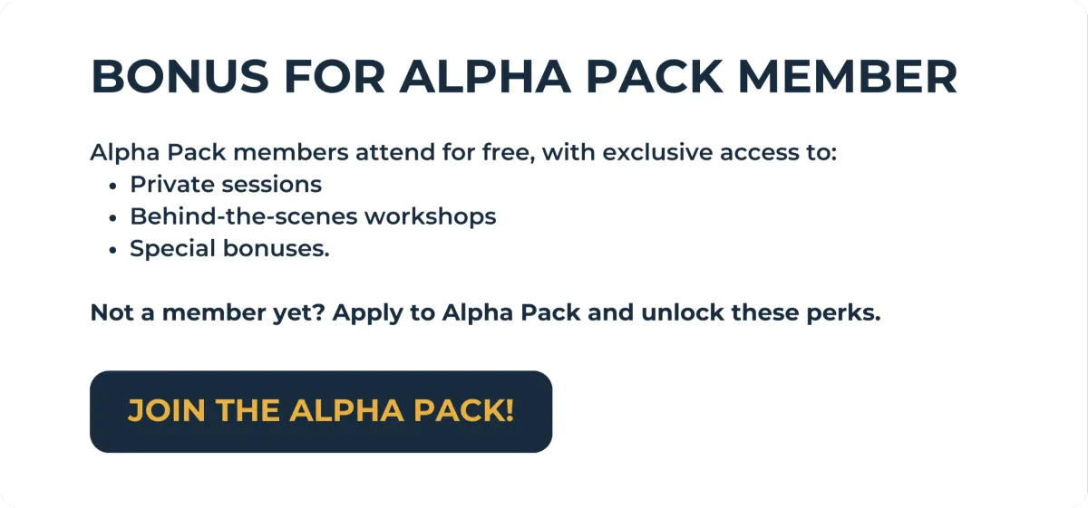 Secure your spot by paying $1,000 (instead of $2000) for your first month of Alpha Pack membership, plus a $500 Summit deposit. The $500 deposit will be refunded a week before the Summit. To keep your Summit access, you must remain an Alpha Pack member until the event.
