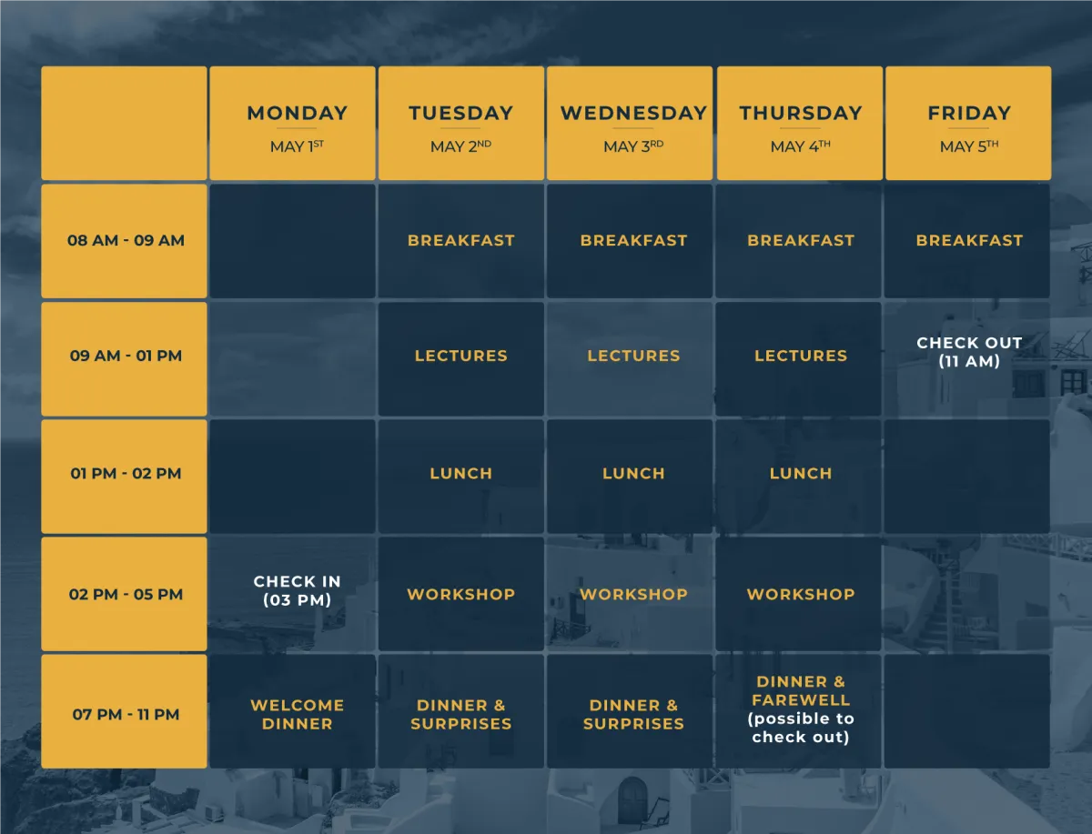 Attendees are expected to check in on May 1st and attend a welcome dinner at the hotel. The main event will be held from May 2nd to May 4th, with the official conclusion taking place on May 4th after a farewell dinner. Participants have the option to either depart on the evening of May 4th or stay until the morning of May 5th.